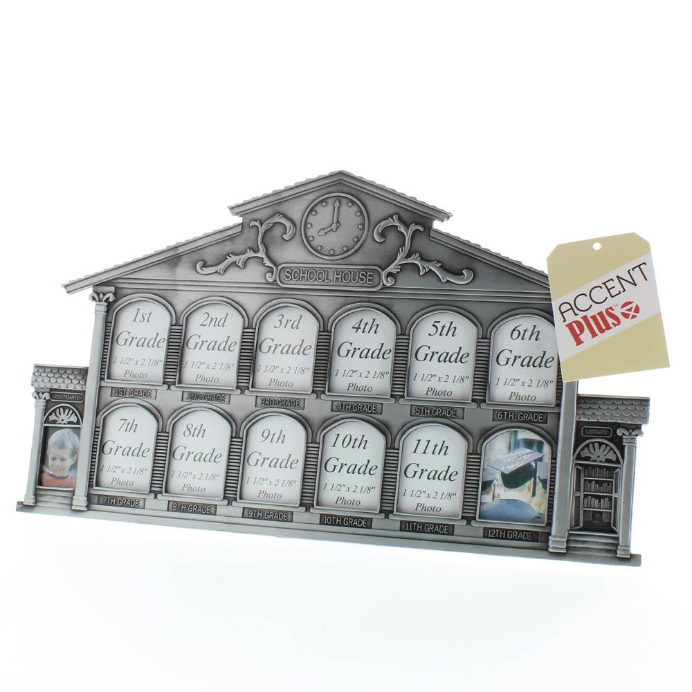 • Remember your child's school days with this pewter finished picture frame shaped like a schoolhouse. Enough wallet sized spaces for grades K–12 featuring an easel back for easy display.