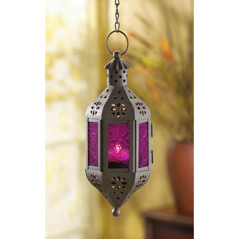 • Handsomely styled cutout metalwork recalls the beautiful hand-wrought lamps of a Moroccan marketplace. Four purple-toned panes of patterned glass cast a fascinating halo of light! A candle’s glow becomes magical as it shines from within.