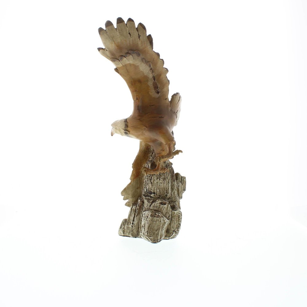 • Wings held wide, a proud eagle effortlessly rides the mountain breeze. This stunning sculpture is a genuine collector's delight, exactly resembling hand-carved burlwood.