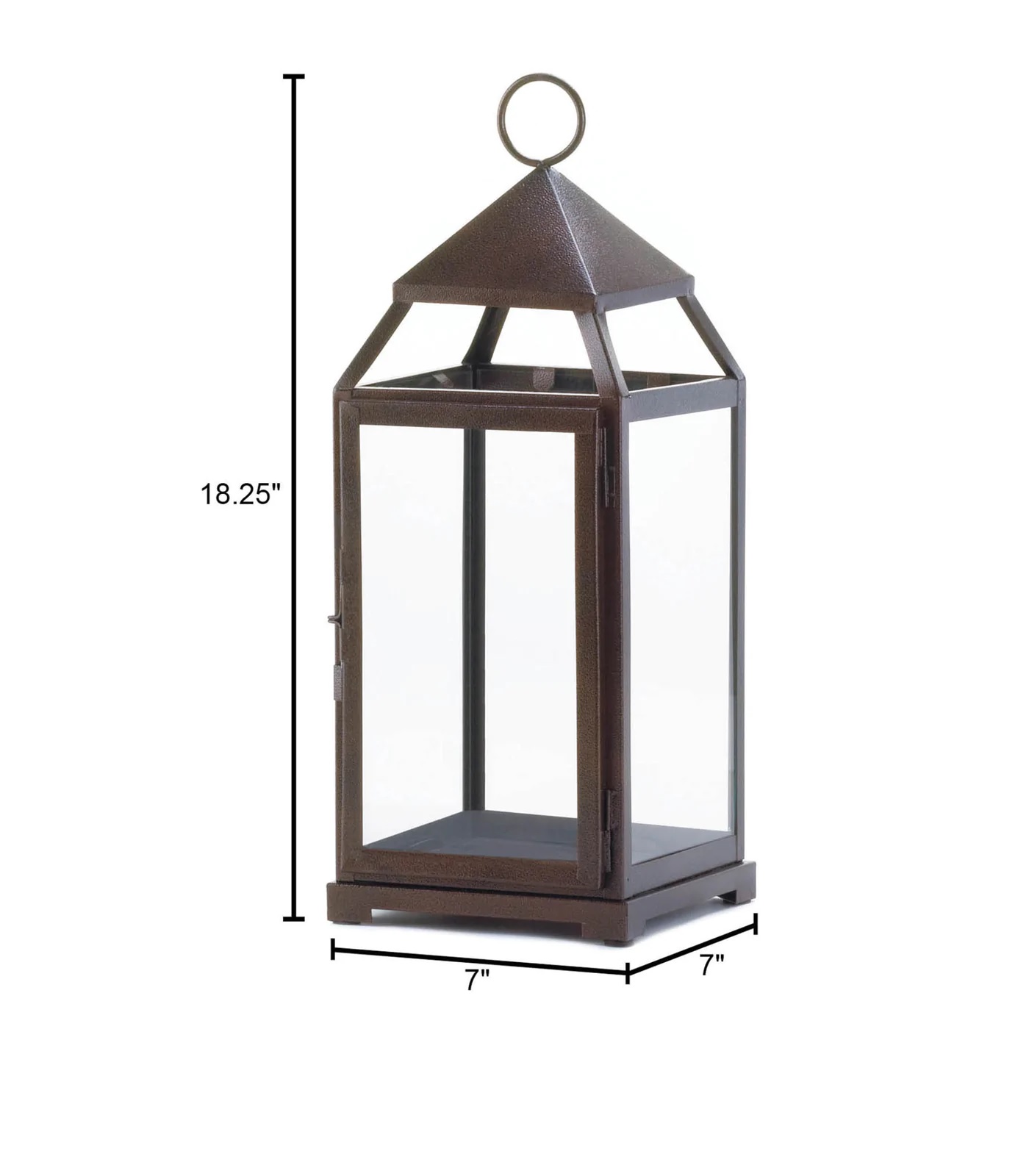 • This large bronzed lantern is the easiest way to create a spectacular setting that will shimmer with style. The iron frame holds four clear glass panels that let the light shine from the candles of your choice.