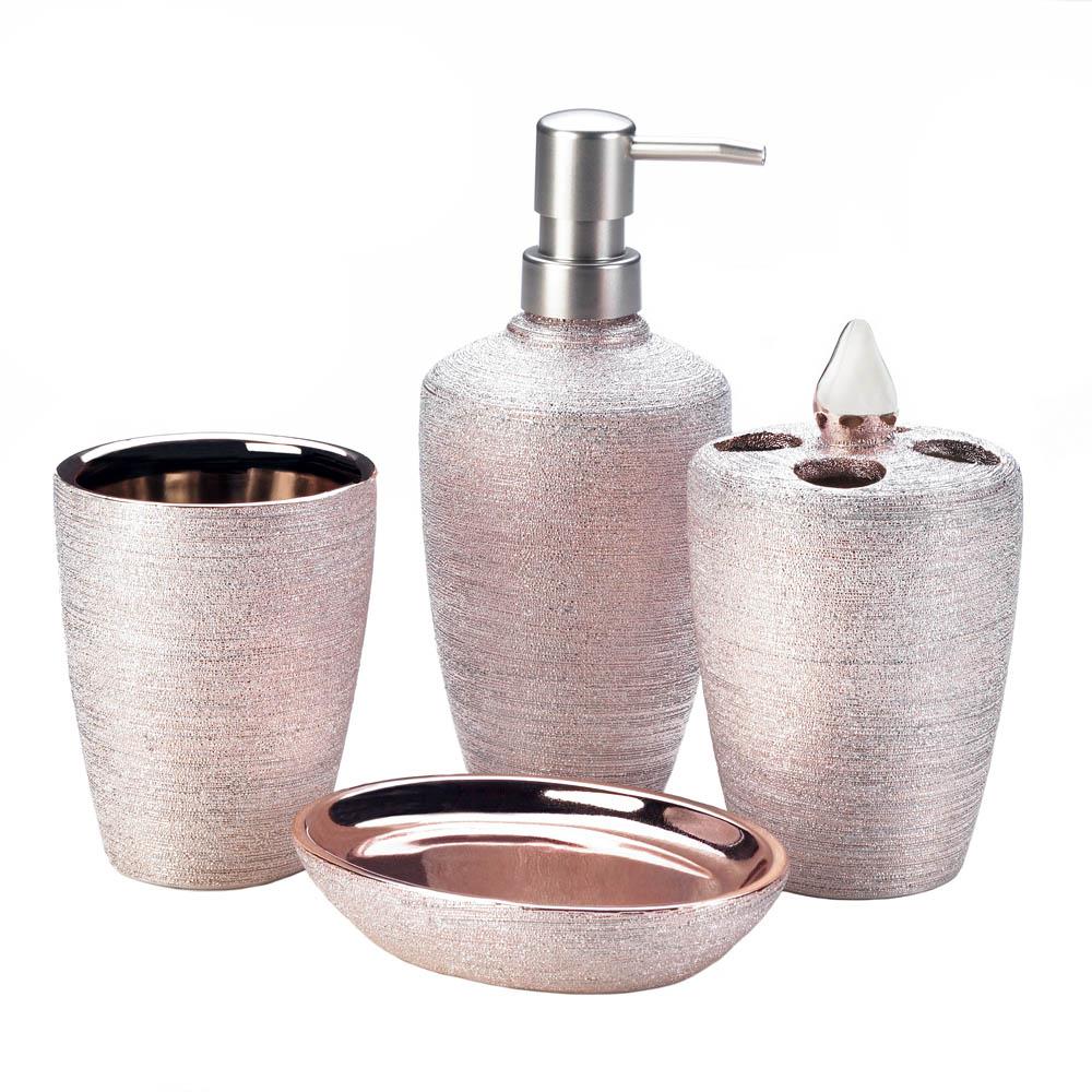 • Chic rose gold shimmer will make your bathroom a stylish oasis! This lovely bath accessory set includes a soap/lotion pump, toothbrush holder, soap dish and cup.