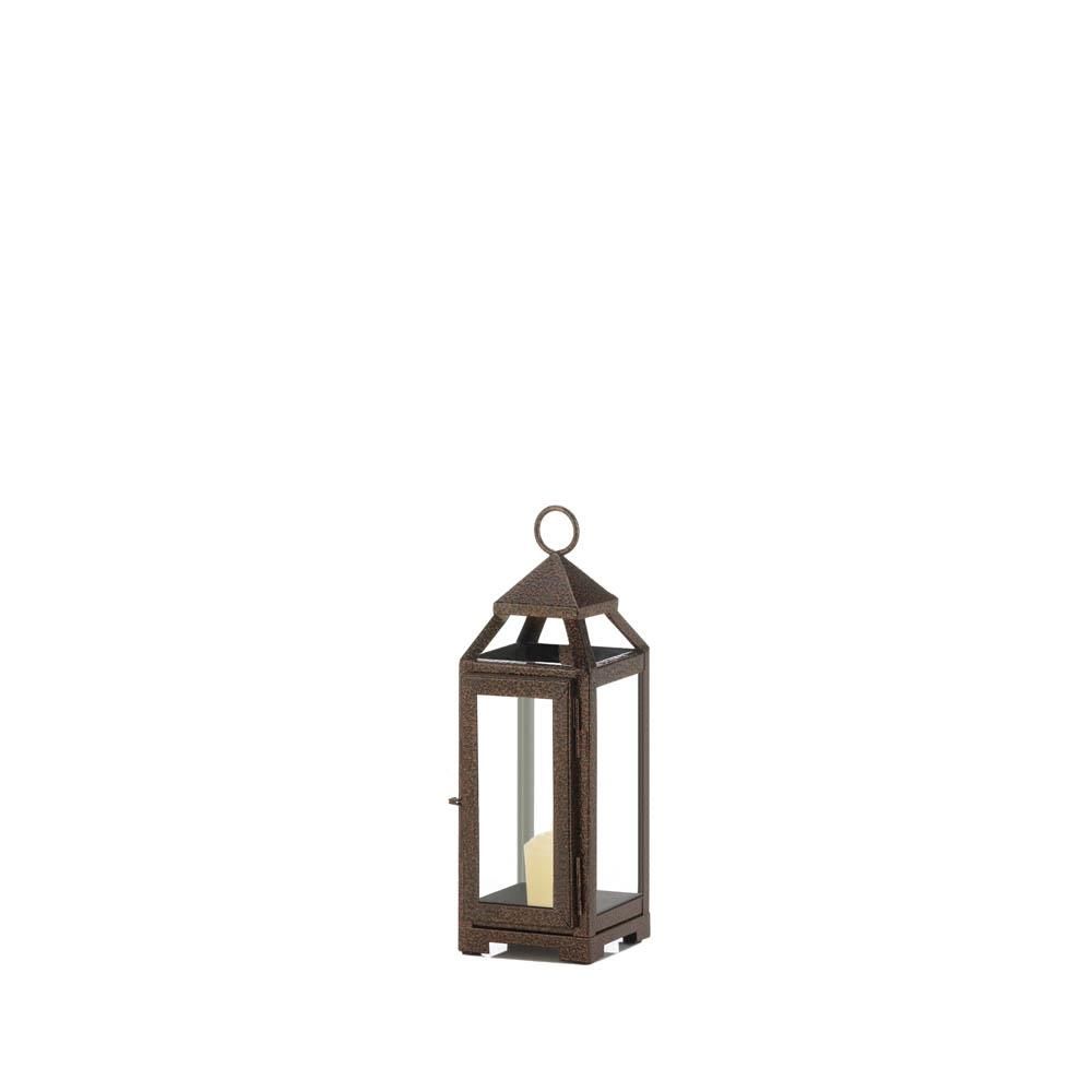 Charming and chic, this mini copper lantern will add a rustic look to your indoor or outdoor decor. The decorative lantern features an iron frame in a speckled copper finish, encased with glass window panes. Place a pillar candle inside the small lantern to illuminate any space in a soft and subtle glow. Weight 1.2 pounds. 3.5" x 4" x 11". Iron, Glass. UPC Number: 849179038021.