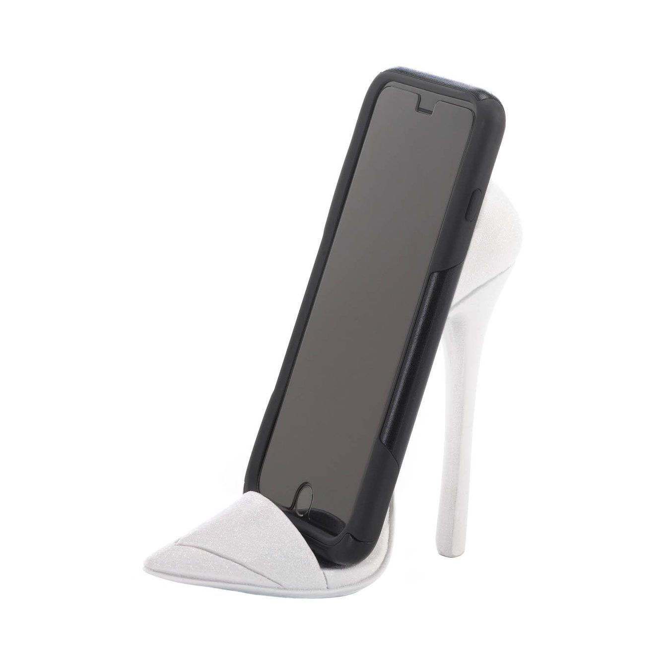 A stylish addition to your desk or vanity table, this dazzling white shoe phone holder will keep your phone close at hand. The chic high heel shoe design offers fashion and function, making it a great tabletop decor piece. The shoe cell phone holder fits most standard size phones standing up so you can watch videos and tutorials on your phone hands-free. Phone not included. Weight 0.4 pounds. 6" x 2.5" x 5.25". Polyresin. UPC Number: 849179041649.
