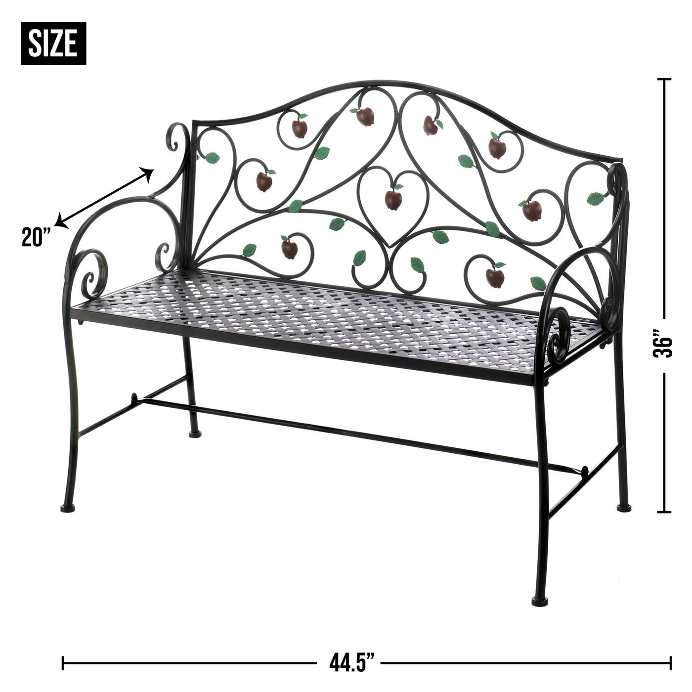 • Enjoy this decorative iron bench detailed with hanging apples. Place in a shady spot under a tree or along a garden path for a place to relax and enjoy nature. Sit side by side with a friend, sipping tea on a beautiful summer day. This bench is perfect if your outdoor entertaining space requires additional seating, place on a deck or patio and add cushions if needed.