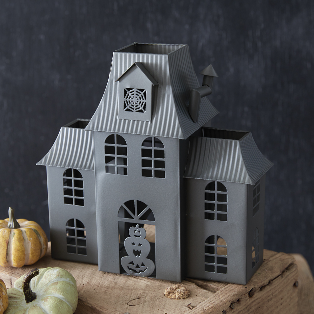 Bring a spooky touch to a home with our Halloween Houses Collection. Featuring jack-o-lanterns in an ominous mansion, this luminary is sure to scare this season. This mansion is made of metal and features an area to insert a tealight, not included. This item would be great displayed in a centerpiece, alone, or with any of our other Halloween House luminaries. Each house includes four surface protective pads.